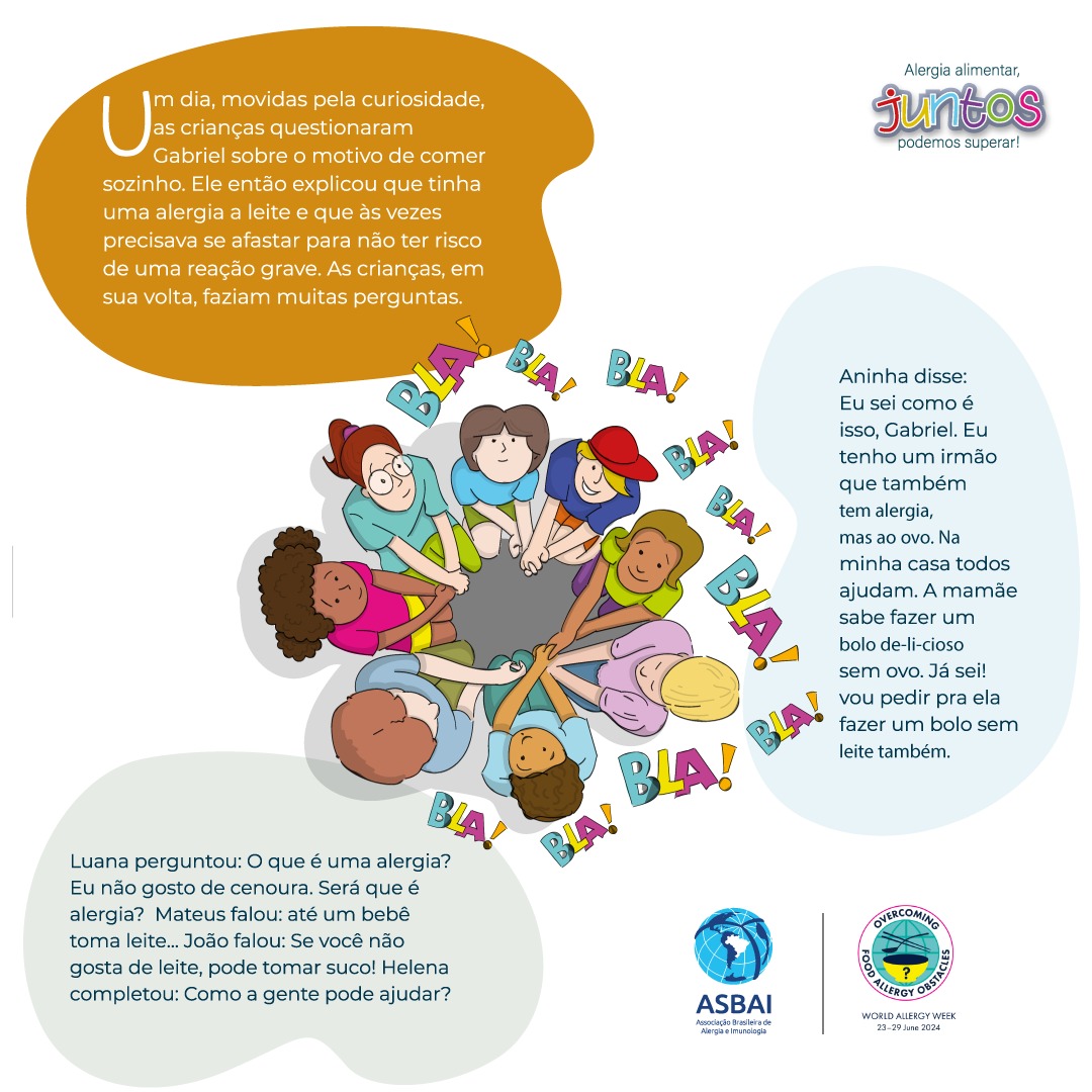Com o apoio da Sociedade Brasileira de Pediatria (SBP) e a colaboração da Alergia Alimentar Brasil, o conteúdo, voltado para crianças e educadores, traz as dificuldades enfrentadas pelo personagem Gabriel, diagnosticado com alergia alimentar. A história se passa dentro do ambiente escolar e visa conscientizar e informar para que a busca do diagnóstico e tratamento sejam adequados, promovendo a inclusão social das pessoas com alergia alimentar.