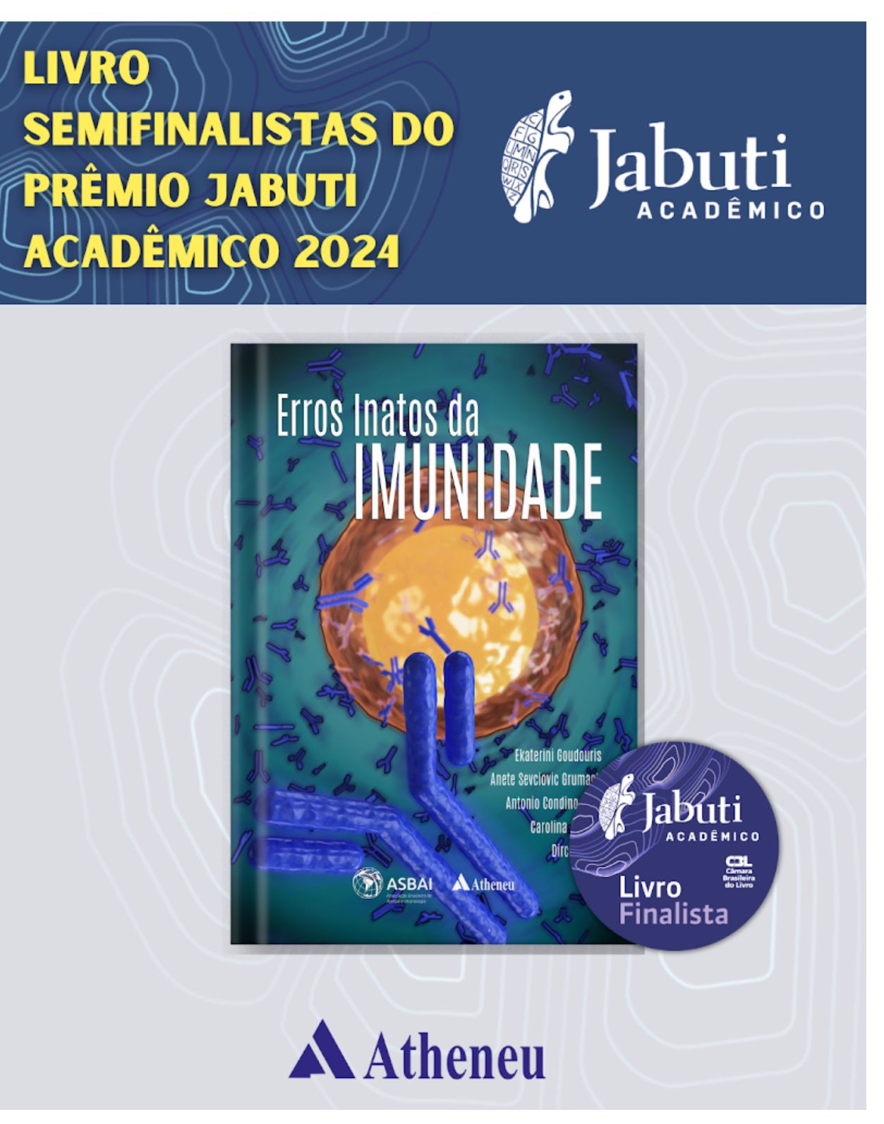 O livro “Erros Inatos da Imunidade” foi selecionado como um dos 10 semifinalistas do prestigiado Prêmio Jabuti Acadêmico 2024. Foram 1.953 obras inscritas, mas apenas 10 selecionadas para a semifinal. Os cinco finalistas, anunciados em 18/07, foram títulos relacionados à área da Saúde Mental.