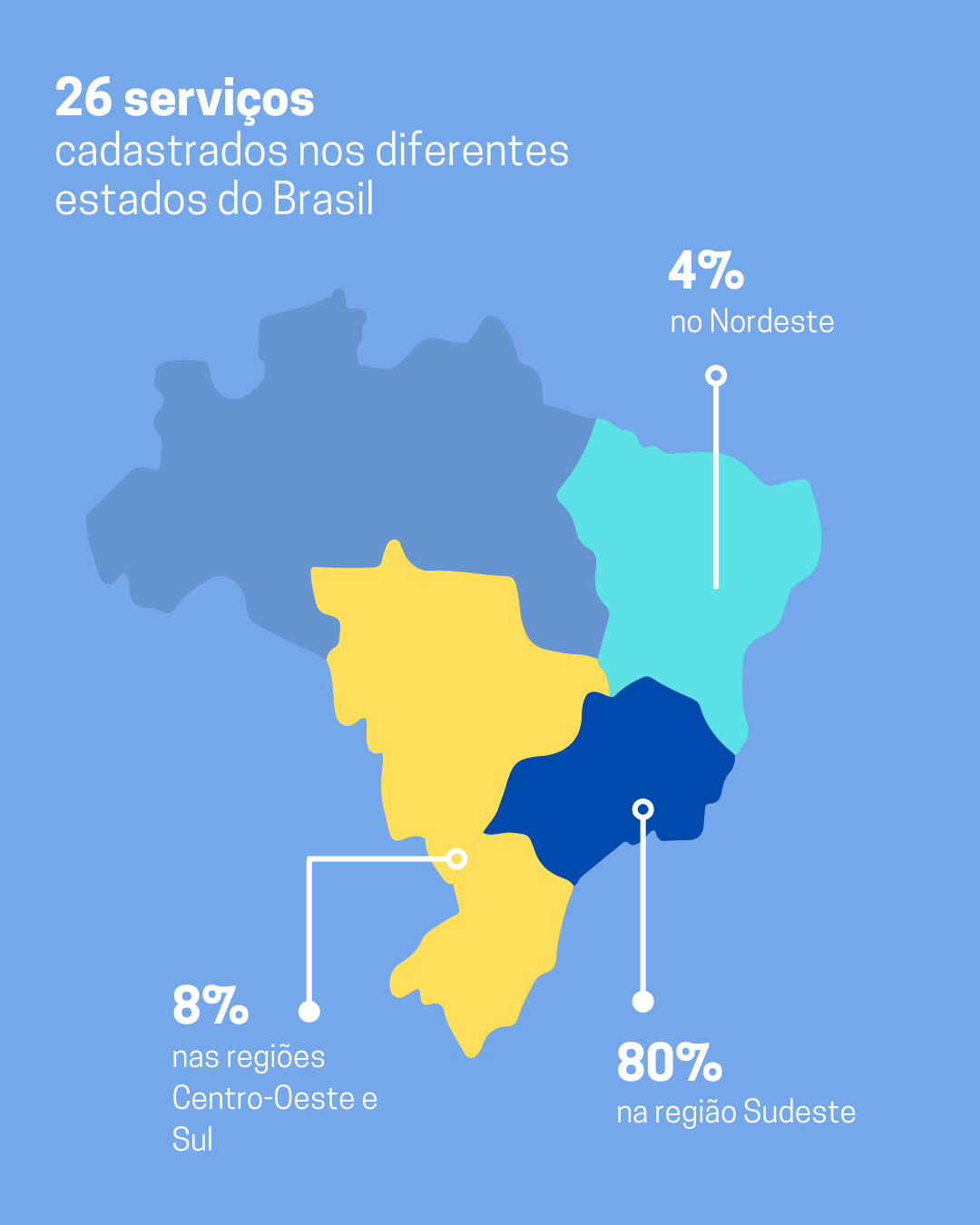 Cadastramento de serviços. Ação contínua da nossa Comissão, que, além de cadastrar novos serviços, verifica os pré-requisitos de serviços cadastrados que atuam na formação do especialista em Alergia e Imunologia, em programas de residência médica, especialização ou pós-graduação lato sensu. Atualmente, temos 26 serviços cadastrados nos diferentes estados do Brasil, sendo 80% na região sudeste, 8% nas regiões centro-oeste e sul e 4% no nordeste.